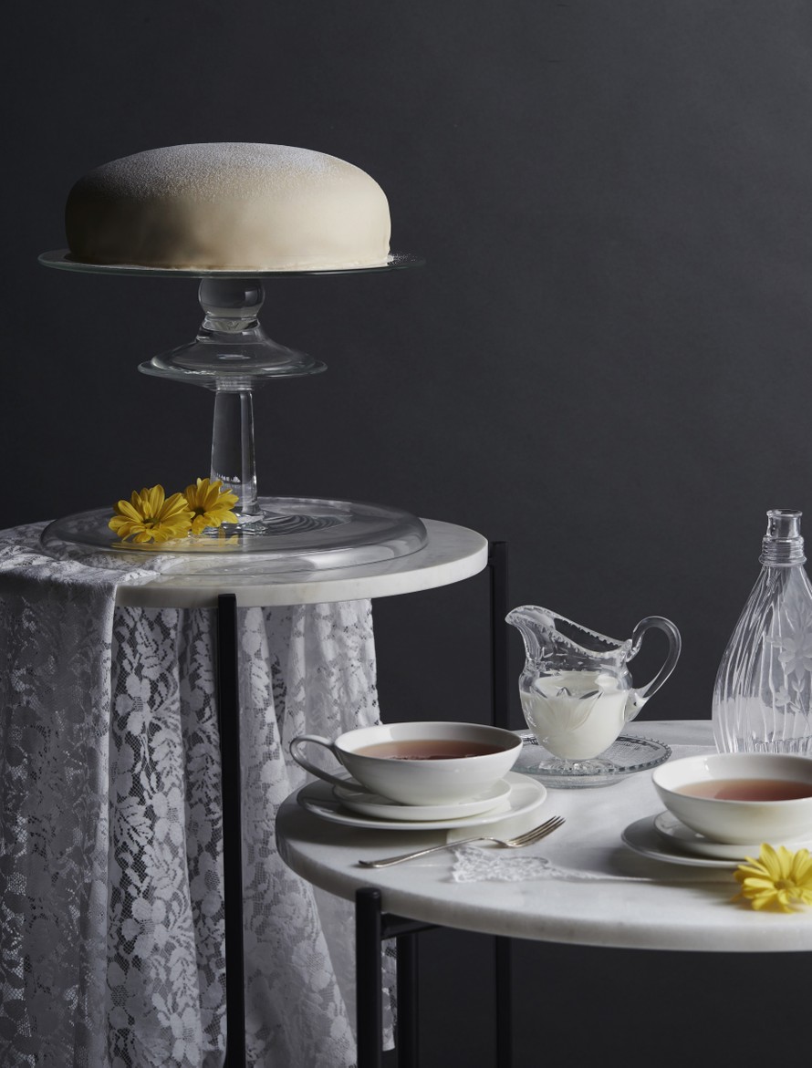 Klassinen prinsessakakku saa raikkaan täytteen mustaherukoista ja sitruunatahnasta. Tyylikkään ulkonäön viimeistelee valkoinen marsipaani tomusokerihunnulla.