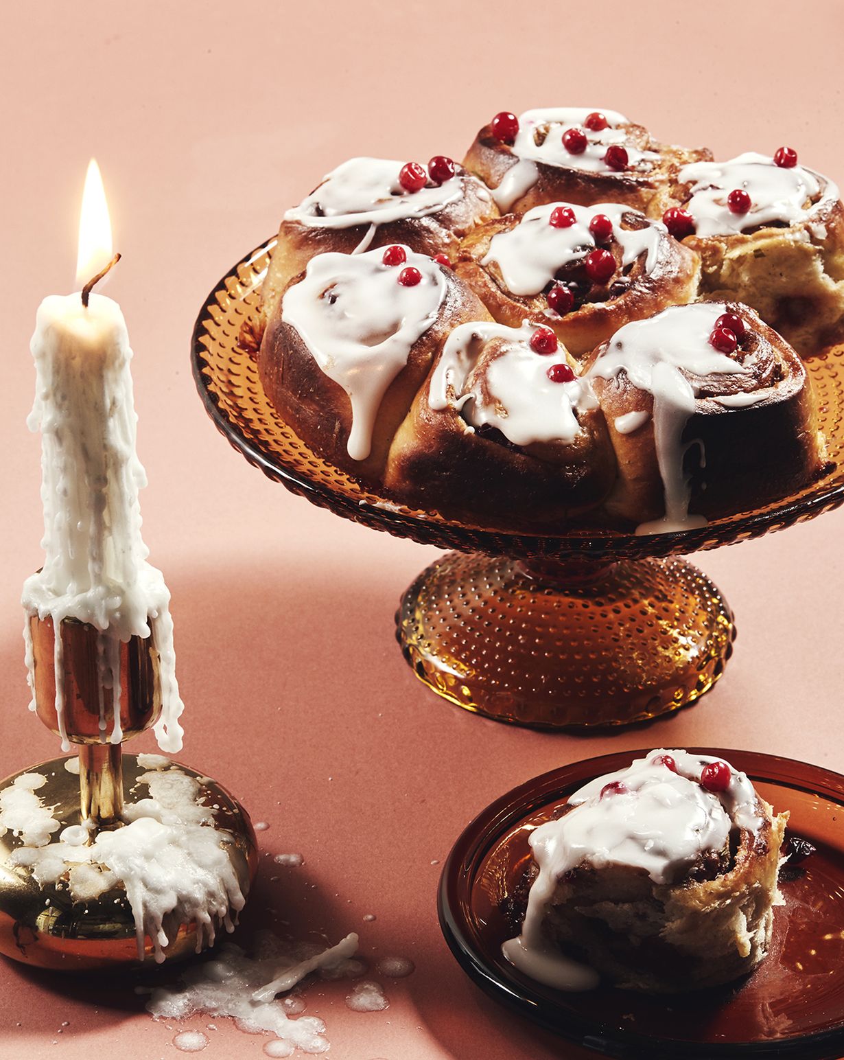 6. Sekoita kuorrutteen piimä ja tomusokeri tasaiseksi. Lusikoi kuorrute jäähtyneen bostonin päälle. Ripottele puolukoita pinnalle.