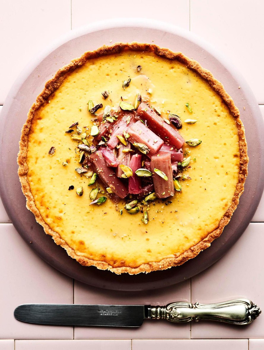 Laita loput raparperit piirakan pinnalle ja koristele halutessasi pistaasipähkinöillä.