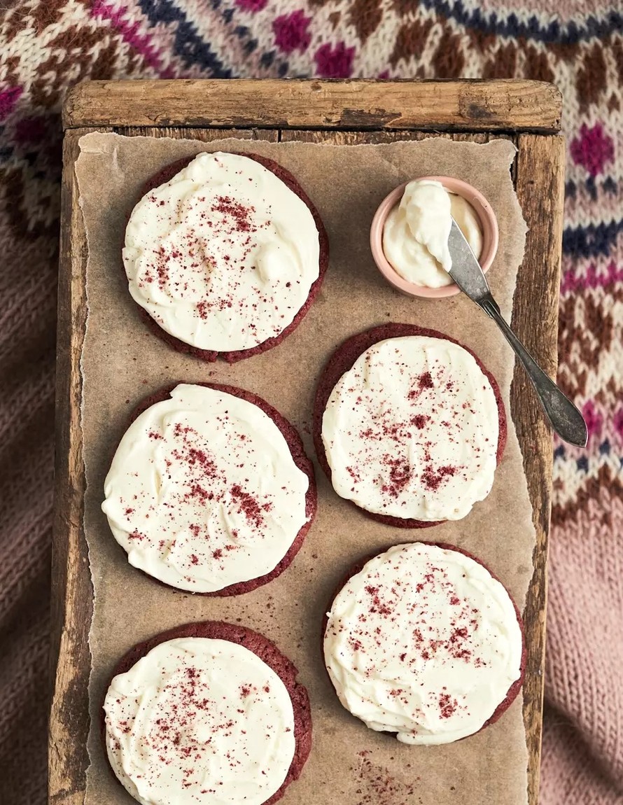 Red velvet -keksit maustetaan vaniljalla ja kaakaolla ja pintaan levitetään tuorejuustokuorrute. Väriensä puolesta keksit sopivat erinomaisesti vaikka pikkujoulujen tarjoilupöytään.