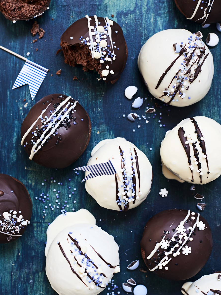 - Kuorruta pullat dippaamalla pinta sulaan suklaaseen. Murusta pakastekuivattuja marjoja pullille, kun suklaa on vielä vähän kosteaa. Valuta suklaiden rippeet raidoiksi päälle.