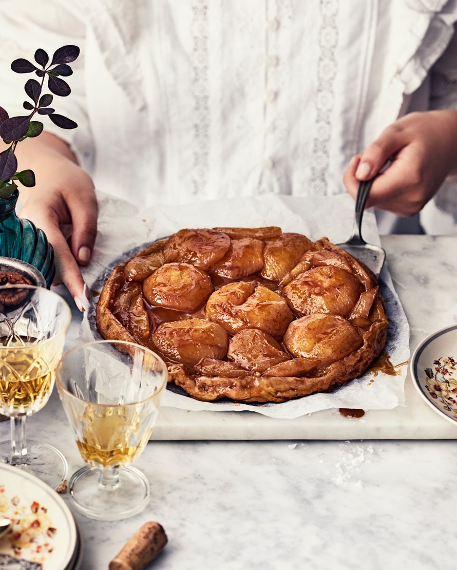 Tuttu omenainen keikauspiiras tarte tatin saa ihanan makunsa karamellisoiduista omenoista. Tässä versiossa makua tasapainottaa ripaus suolaa. Kanelilla maustettu, pehmeäksi vatkattu ranskankerma on tarte tatinille täydellistä seuraa.
