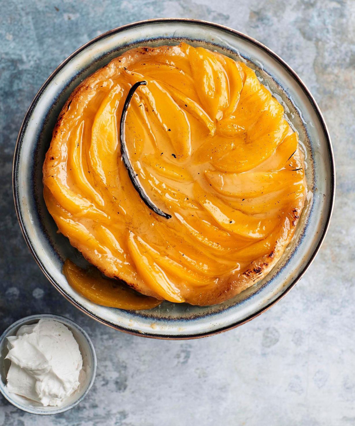 Tarte Tatinin tyylinen keikaustorttu onnistuu myös tuoreista mangoista! Tähän helppoon versioon käytetään valmista voitaikinaa.