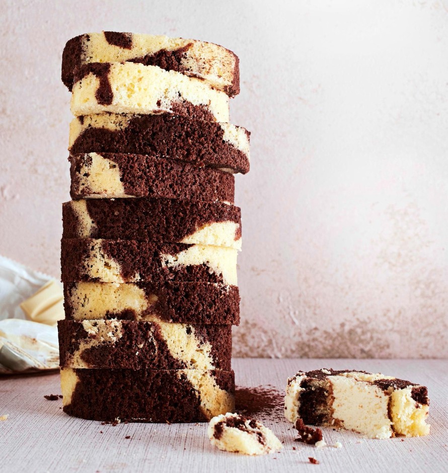 - Nostele tumma taikina nokareiksi tai valuta paksuiksi viiruiksi leivinpaperin päälle pellille. Lisää vaalea taikina tumman lomaan ja päälle. Tasoita varovasti pinnalta.