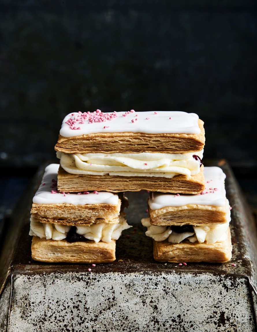 Tuhatlehtiset saavat täytteekseen chai-teellä maustettua kreemiä ja vadelmahilloa. Tarjoa rapeat leivonnaiset heti täyttämisen jälkeen.