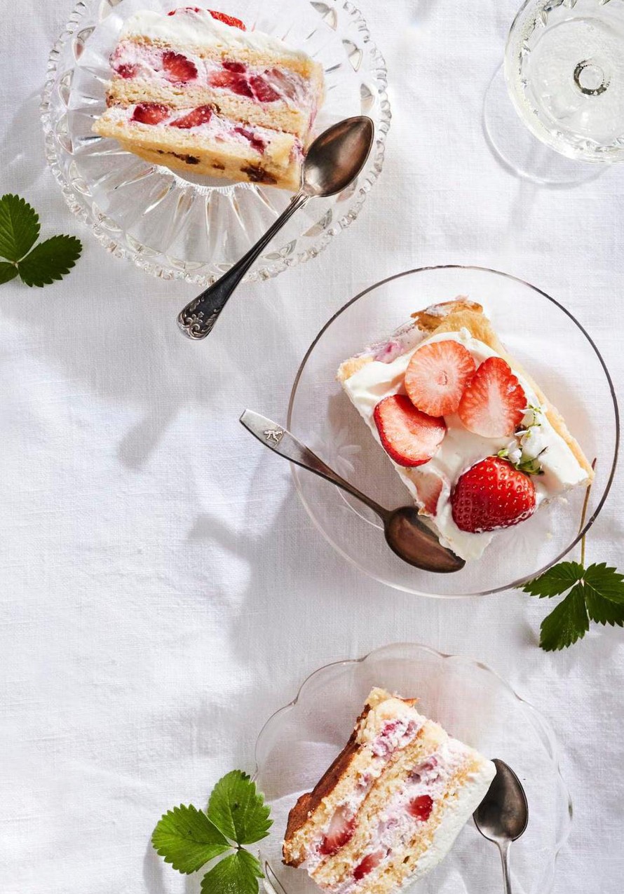 Vaahdota kerma ja levitä rennosti kakun päälle. Koristele puolitetuilla ja viipaloiduilla mansikoilla.