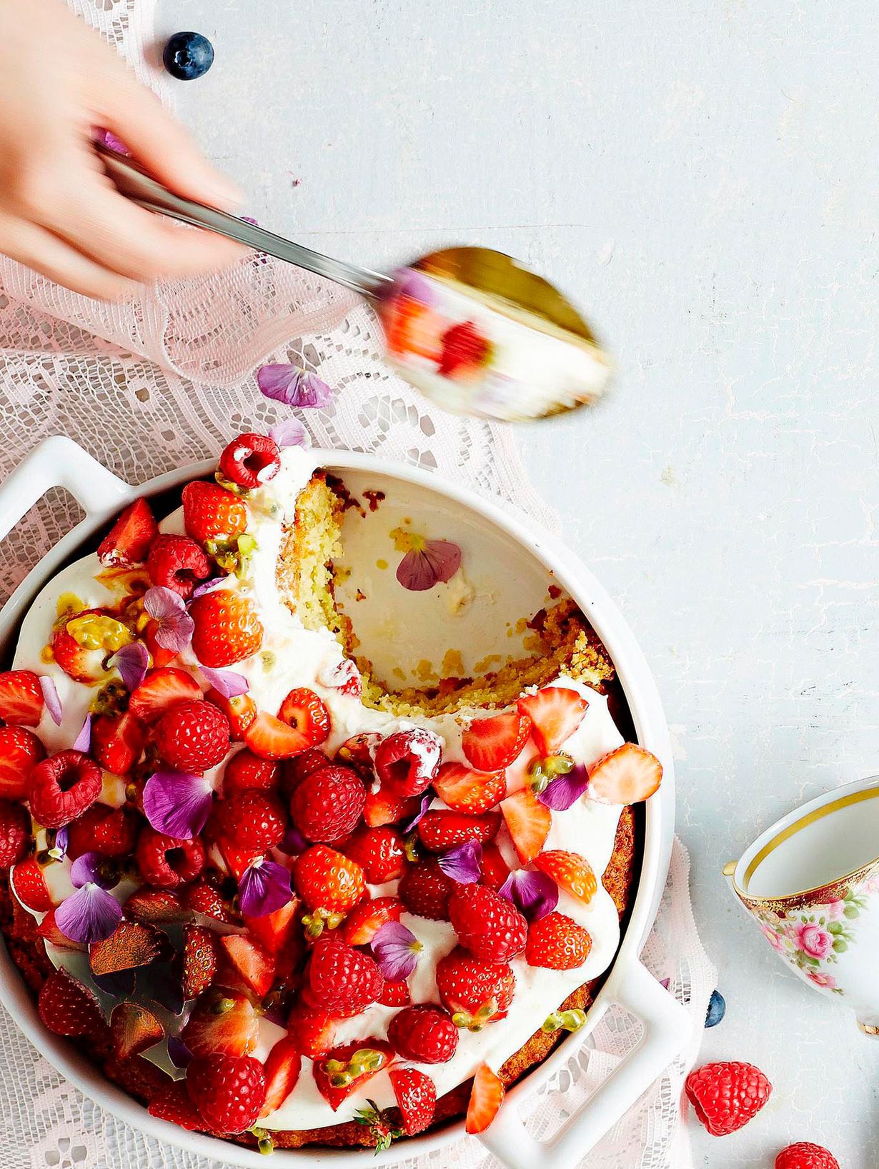 Pyöräytä kesän raikkain kakku helposti vuoassa naistenviikon nimipäiväsankareille. Päälle lastataan keko tuoreita vadelmia ja mansikoita.