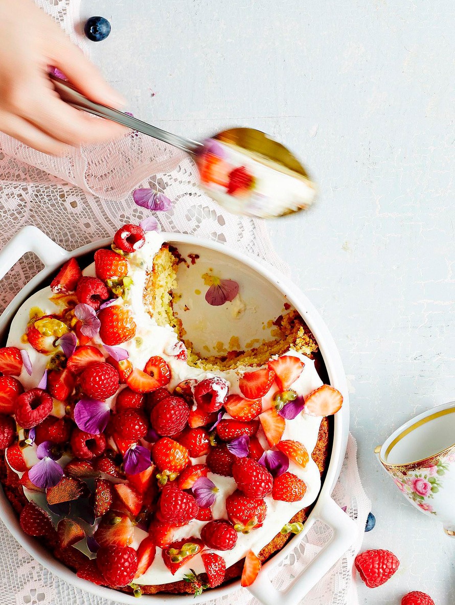 Koristele tuoreilla mansikoilla ja vadelmilla. Purista päälle passiohedelmää.