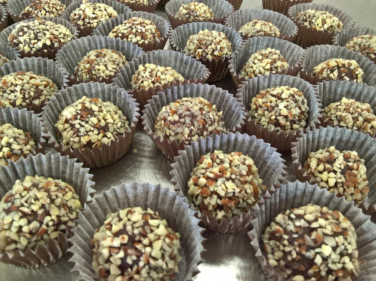 Mittaa vadelma, voi, sokeri ja kerma kattilaan. Kiehauta. Mittaa suklaat astiaan. Kaada suklaan päälle vadelma-seos. Sekoita tasaiseksi. Anna jähmettyä jääkaapissa. Pyörittele massa pieniksi palloiksi. Pyörittele esim. kaakaojauhe essa tai mantelirouheessa.