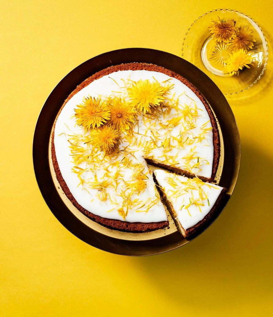 Kuorruta kakku jäähtyneenä. Purista limetin mehu kulhoon ja sekoita tomusokeri joukkoon. Valuta kuorrutus kakulle. Koristele voikukilla.