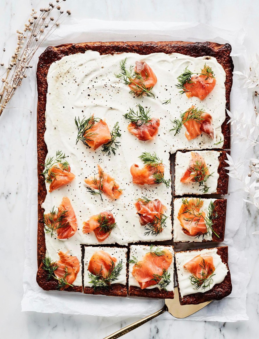 Piparjuurikermalla ja savulohella lastattu peltileipä maistuu alkupalana, kalapöydässä tai illan pikkusuolaisena. Vähäisempi paistoaika on sähkönsäästäjän mieleen.