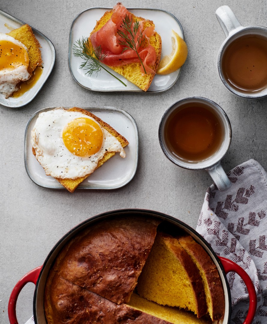 Kuumenna uuni 175-asteiseksi. Voitele leipä kananmunalla ja kypsennä noin 45 minuuttia. Anna jäähtyä hetki ennen padasta irrottamista.