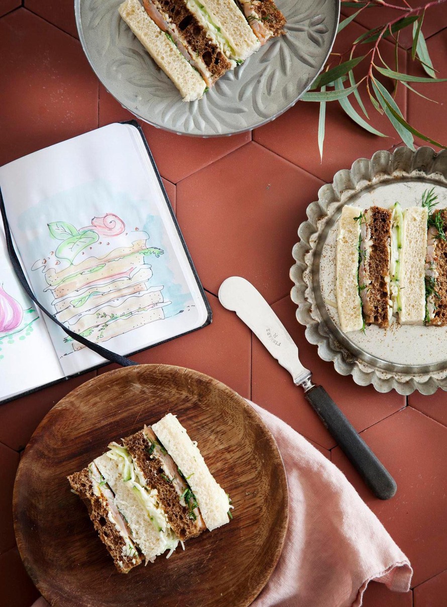 Sivele kolme tummaa leipäpalaa voilla ja lado rinnakkain kelmun päälle. Levitä sinappia leiville. Laita päälle puolet lohesta ja päälle hienonnettua tilliä.
