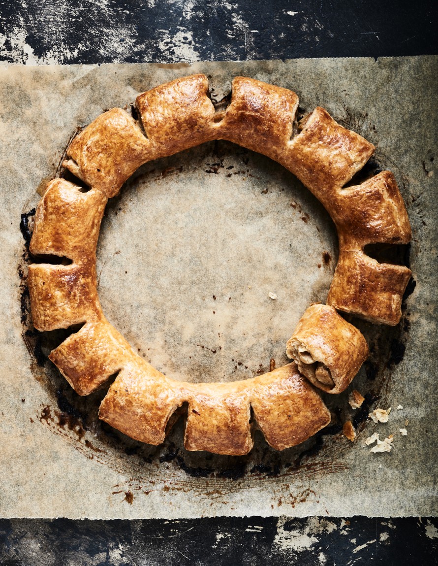 Suolaisen kranssin sisälle kääräistään tällä kertaa yrteillä maustettua makkaraa. Sekoittamalla valmistuva voitaikina on helppo, kunhan varaat aikaa sen jähmettymiseen.