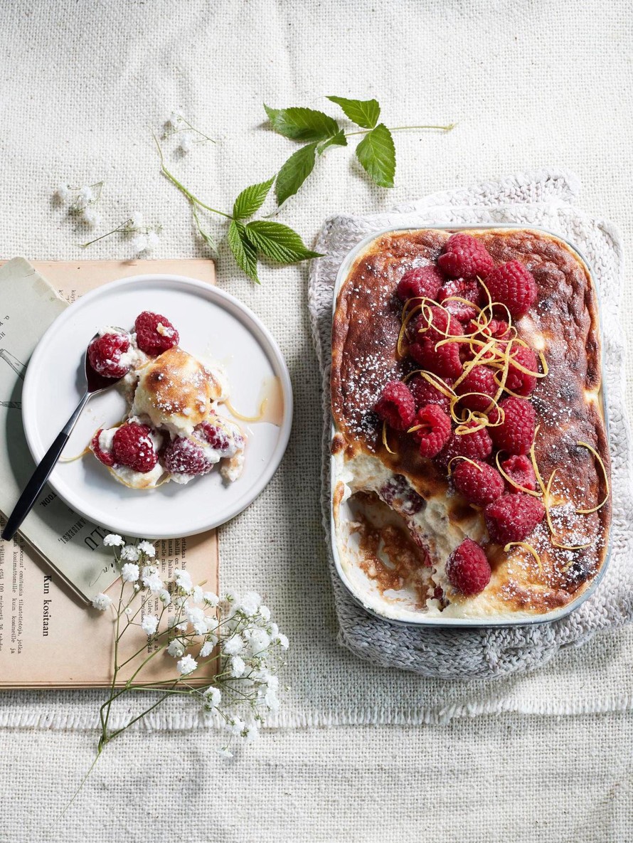 Peittele ihana vadelmasato pehmeän vaahtopilven alle! Tälle paistokselle riittää muutama minuutti todella kuumassa uunissa. Tarjoa se heti uunista ottamisen jälkeen.