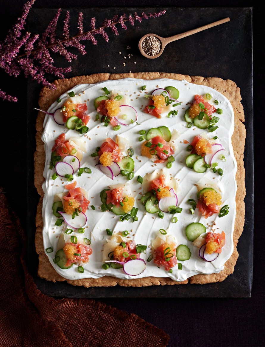 Leikkaa lohi suikaleiksi. Valuta inkivääri. Leikkaa kurkut ja retiisit ohuiksi viipaleiksi ja kevätsipuli renkaiksi. Jaa päälliset ranskankermatäytteelle. Lusikoi mätiä ja ripottele seesaminsiemeniä päälle.