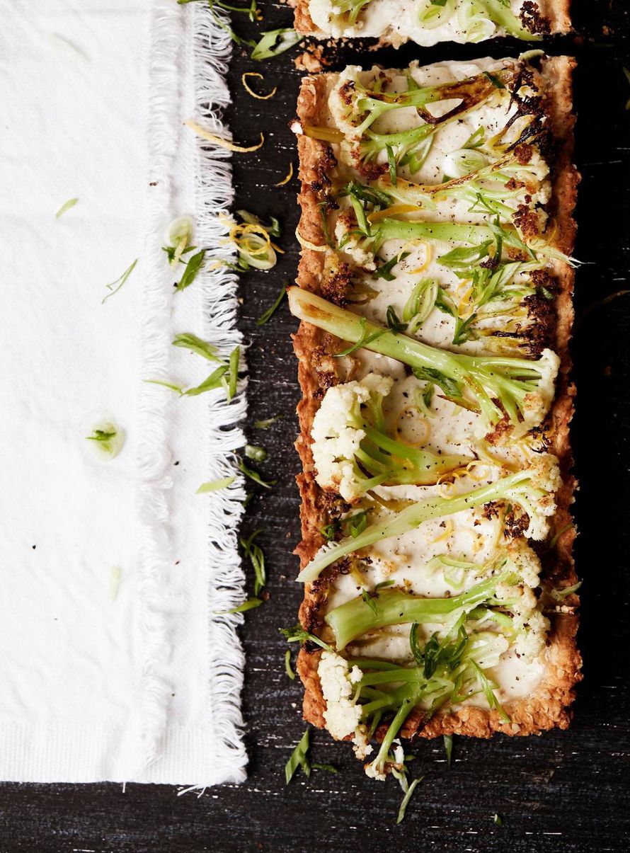 - Yhdistä kaurakerma, tuorejuusto, mausteet ja sitruunamehu. Levitä täyte piiraspohjalle. Asettele päälle kukkakaalit lomittain.