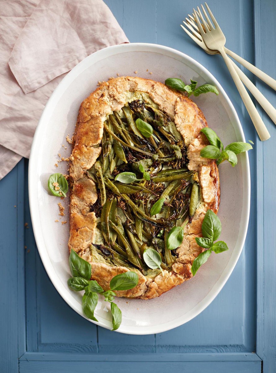 Galette on ranskalainen, ilman vuokaa paistettava piirakka. Kevään juhliin se täytetään vihreillä kasviksilla ja pesto-maustetulla juustolla.