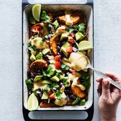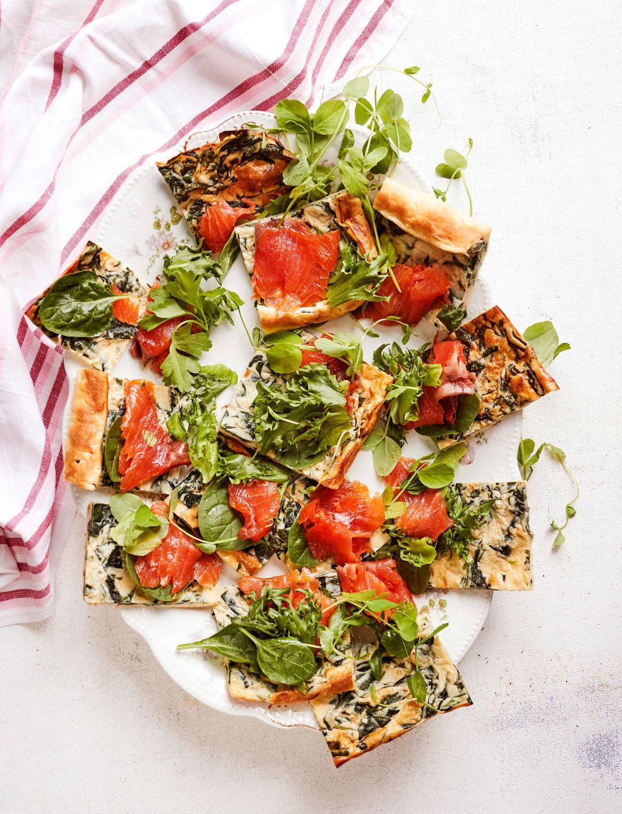 Kylmäsavulohella ja raikkailla vihreillä peitelty pellillinen pannaria on vaivaton lounas isollekin juhlaporukalle.