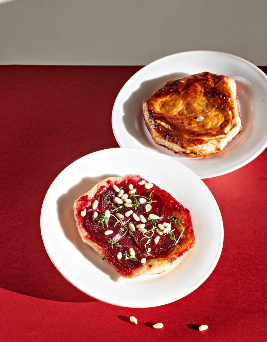 Tarte Tatinin tyyliset minipiirakat valmistaikinasta ihastuttavat helppoudellaan. Glögi-illan hittiherkuissa maistuvat punajuuri ja vuohenjuusto.