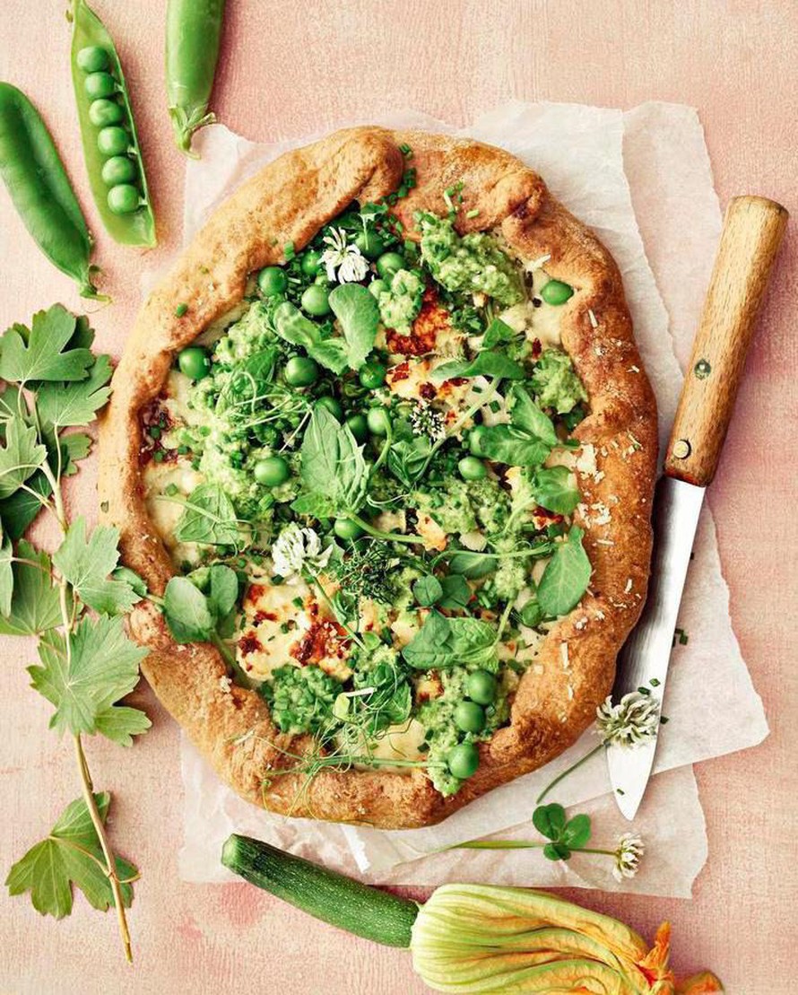 Levitä tahna galetelle, koristele herneillä ja viimeistele halutessasi herneenversoilla tai mintulla.
