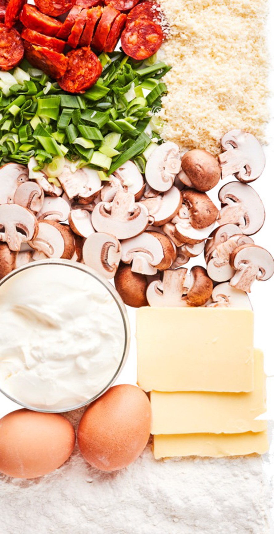 Kuori ja viipaloi chorizo. Viipaloi sienet. Suikaloi kevätsipulit. Vatkaa kerma ja munat.