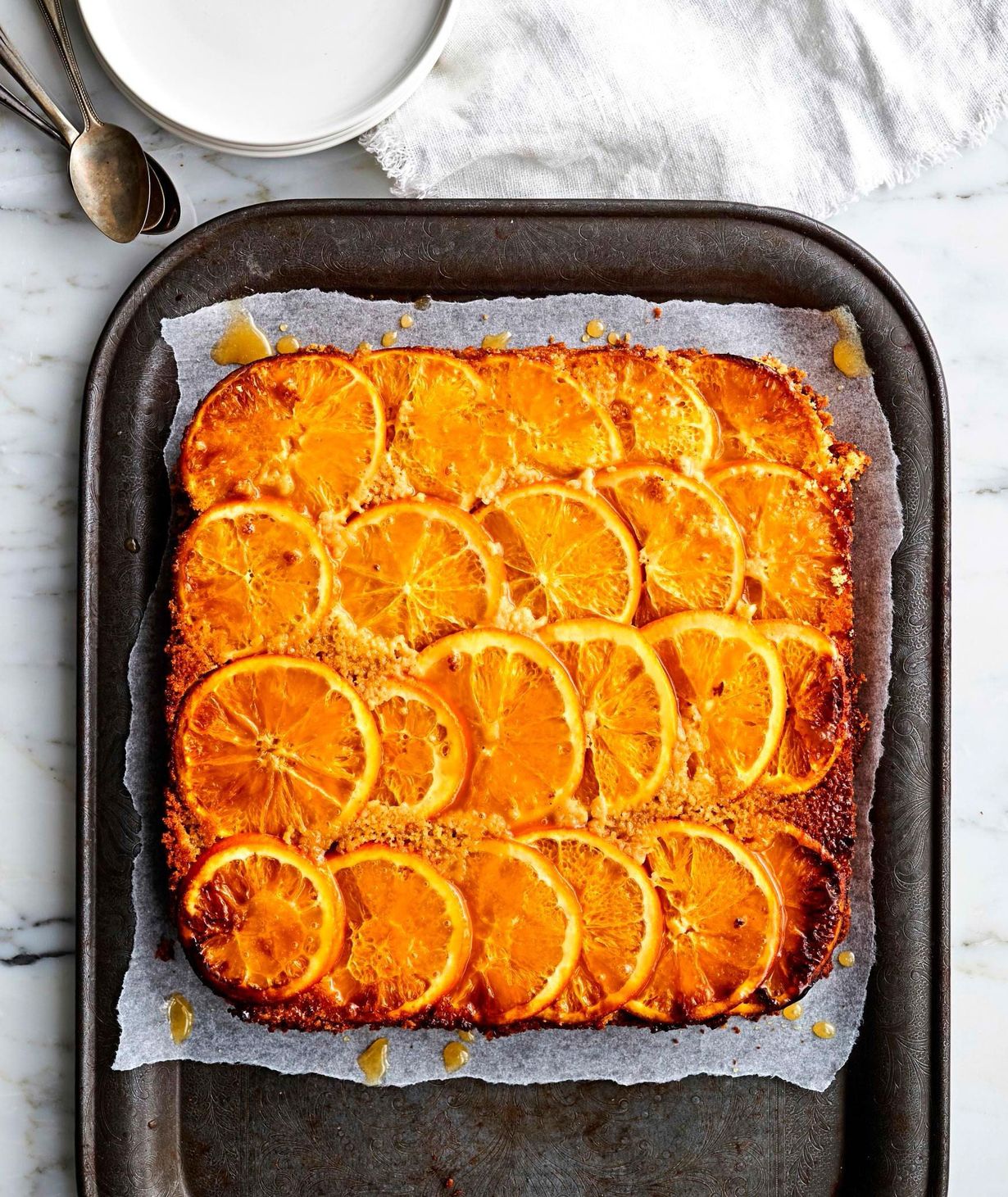 Huom! Valitse kakkuun tiivis irtopohjavuoka, jotta appelsiineista irtoava mehu ei valu uunin pohjalle. Voit halutessasi levittää leivinpaperiarkin ritilälle paistamisen ajaksi, jolloin uuni pysyy siistinä.