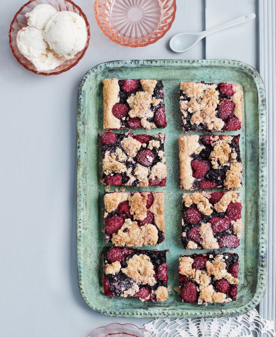 Vuoraa piiraspelti (25 cm x 37 cm) leivinpaperilla. Painele taikina jauhotetuin käsin pellin pohjalle. Jos käytät pakastemarjoja, sekoita perunajauho marjojen joukkoon.