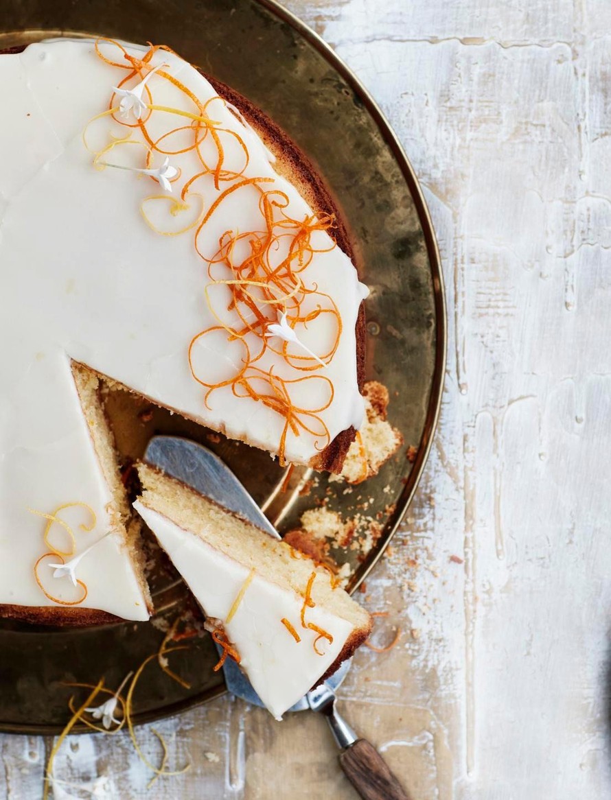 Tärkeä osa kakkua on yksinkertainen ja raikas kuorrutus, joka valmistuu tomusokerista ja appelsiinimehusta sekoittamalla. Kun se on jähmettynyt, voi lohkaista lautaselle ensimmäisen palan.