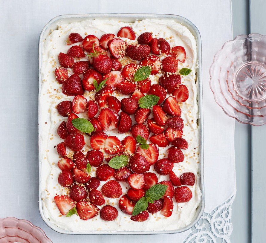 Kakun keikkumista ei tarvitse jännittää, kun mansikkakermakakku kootaan suoraan vuokaan. Jos herkun ei tarvitse olla gluteeniton, voit vaihtaa perunajauhot vehnäjauhoihin.