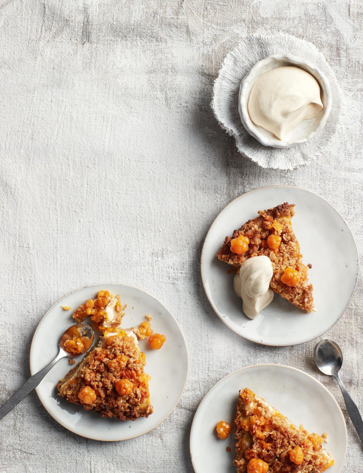 Rapea ja runsaskuituinen piirakkapohja sisältää granolaa ja talkkunajauhoa. Siinä maistuu ihanasti kardemumma ja viimeisen silauksen luo voi, joka ruskistetaan ennen sekoittamista muiden ainesten joukkoon.