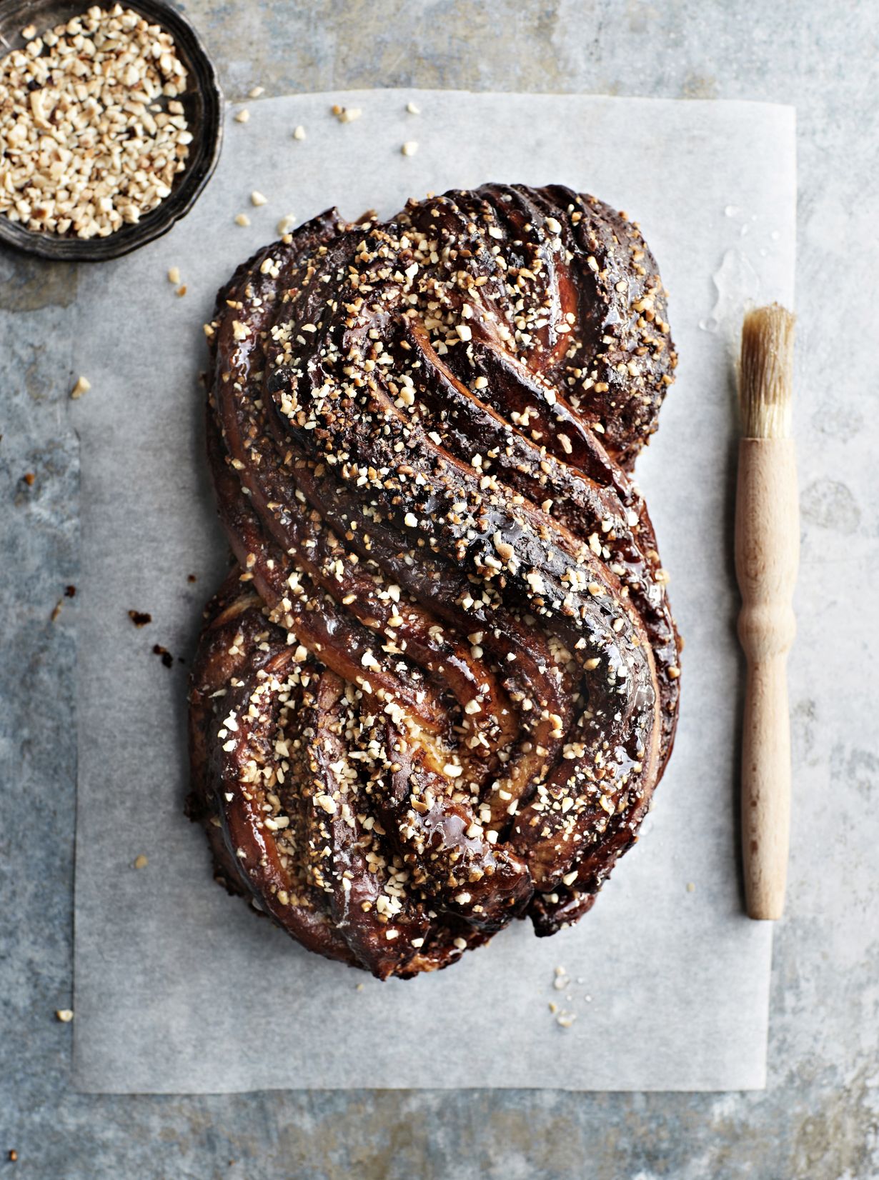 Upeaksi punottu babka-pulla on juutalaisyhteisöissä perinteinen leivonnainen. Tällä kertaa babka raidoitetaan hasselpähkinä-suklaatahnalla.