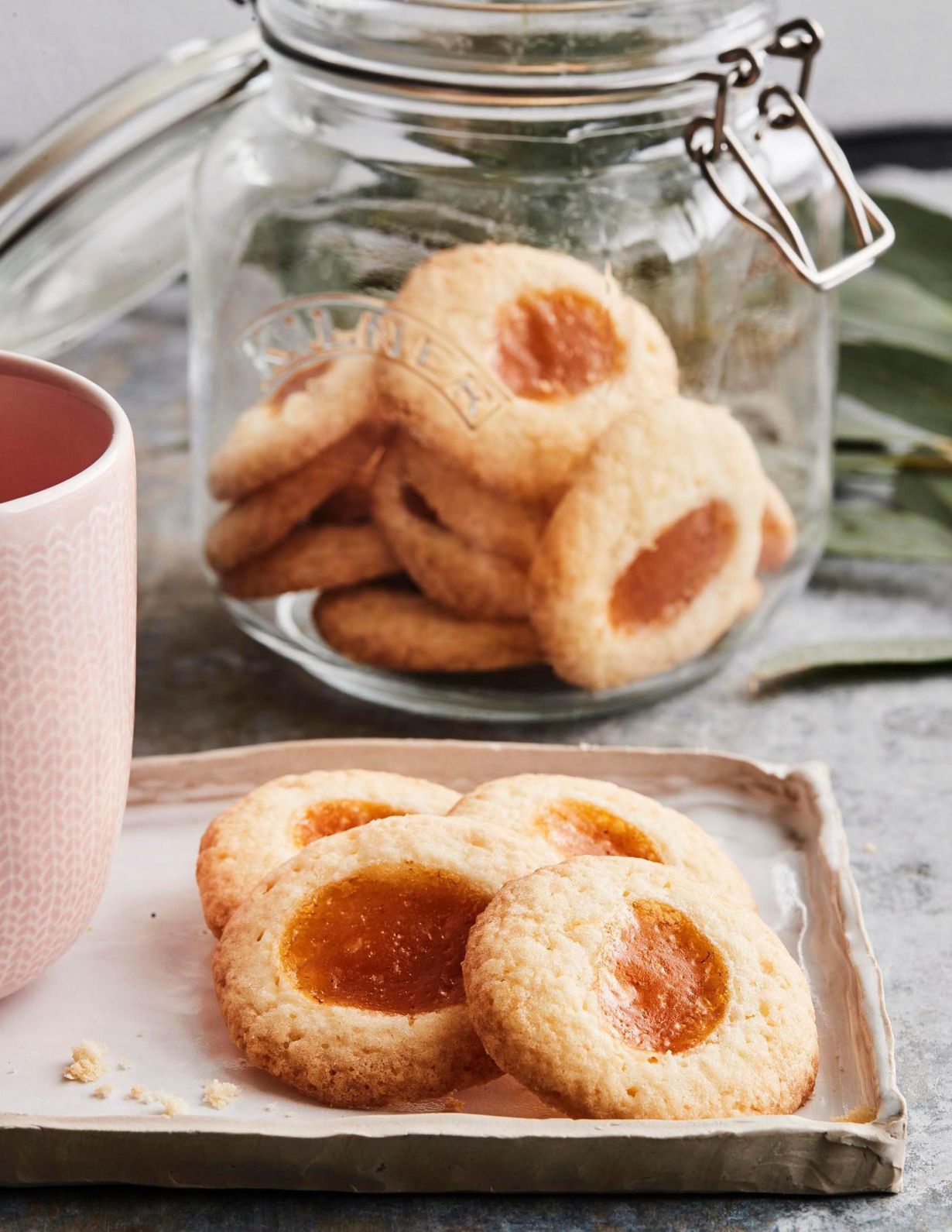 - Sekoita lakkahilloon perunajauhot. Laita noin teelusikallinen hilloa pikkuleipien koloihin. Kypsennä uunissa 12–15 minuuttia. Anna jäähtyä hetki ennen tarjoamista.
