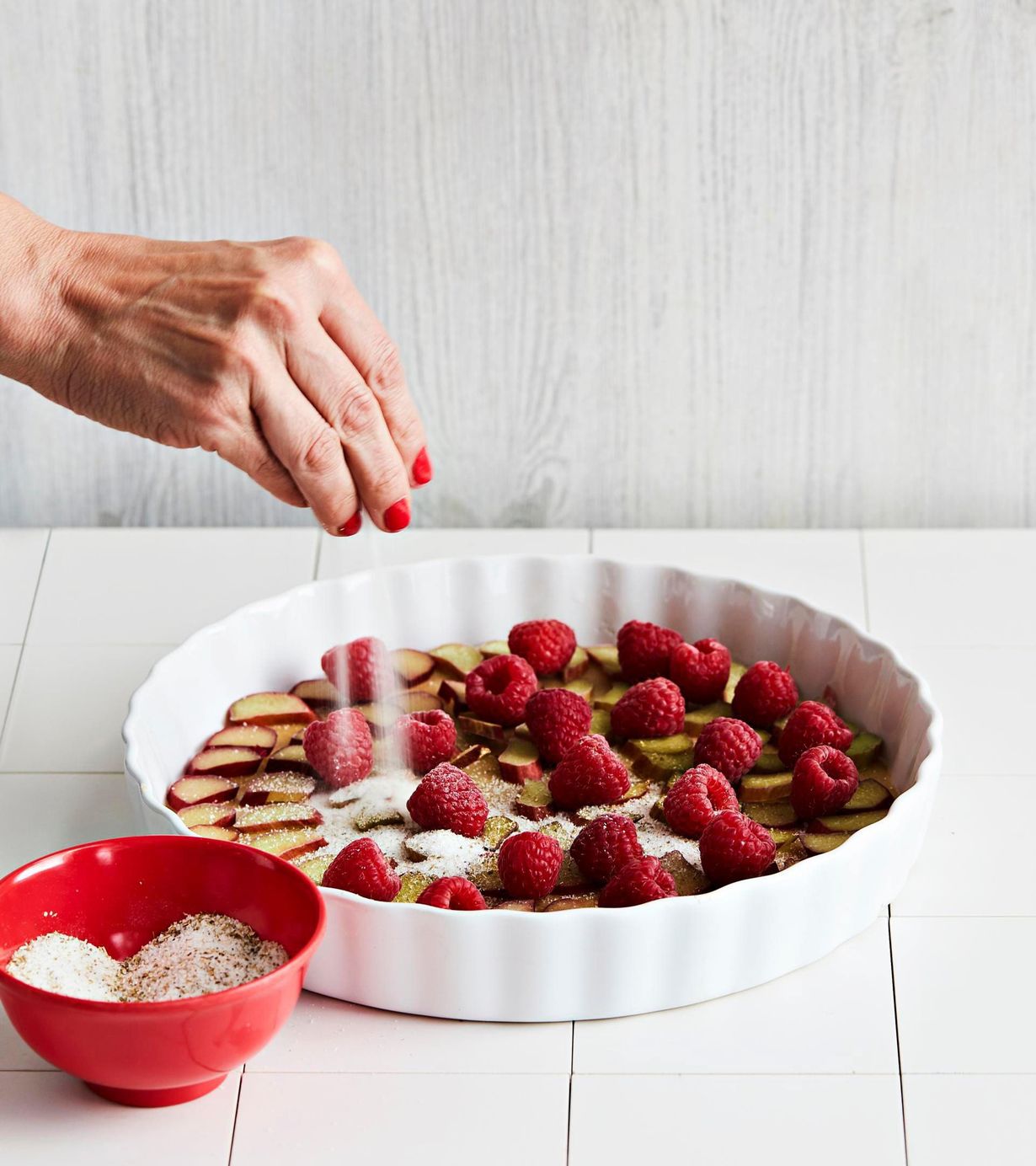 - Paloittele raparperit. Levitä vadelmien kanssa taikinan päälle. Aja tehosekoittimessa sokeri ja teepussin sisältö. Kaada vadelmien ja raparperin päälle. Kypsennä 30 minuuttia.