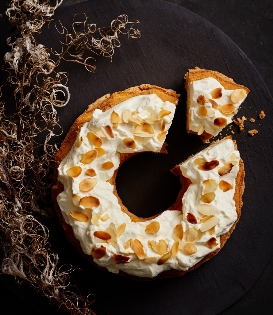 Laskiaispullan hengessä toteutettu kardemummakakku maistuu talvisena jälkiruokana. Kakun päälle tulee mantelitäytettä sekä kermavaahtoa.