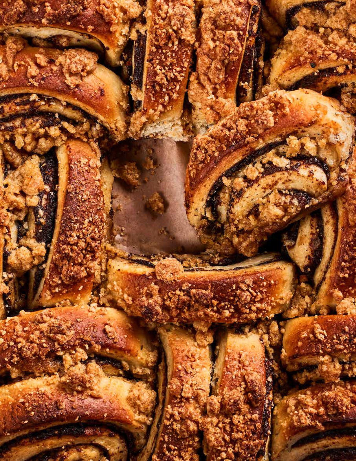 Kumoa taikina kevyesti jauhotetulle alustalle, ja kauli se noin 60 cm x 30 cm:n kokoiseksi levyksi. Levitä mämmi levylle ja ripottele suklaarouhe päälle. Kääri levy rullaksi pitkältä sivulta. Leikkaa rulla suoraan noin 2 cm:n levyisiksi pikkupuusteiksi. Lado puustit vierekkäin leivinpaperin päälle pikkupellille tai suorakaiteen muotoiseen uunivuokaan (n. 30 cm x 20 cm). Jätä pullien väliin ½ cm:n rako kohoamista varten. Anna pullien kohota liinan alla noin 20 minuuttia.