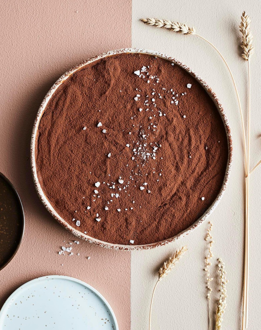 Jäähdytä piiras kunnolla ja siirrä se jääkaappiin. Piiras on parhaimmillaan seuraavana päivänä. Siivilöi valmiin kakun pinnalle kaakaojauhetta ja ripottele sormisuolaa.