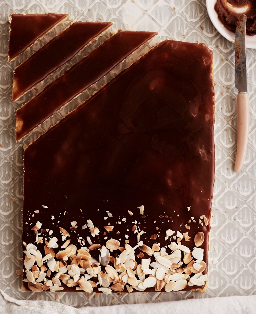 - Leikkaa kakkulevy haluamasi kokoisiksi paloiksi. Paahda mantelilastuja kuumassa, kuivassa pannussa pari minuuttia ja ripottele ne paloille.