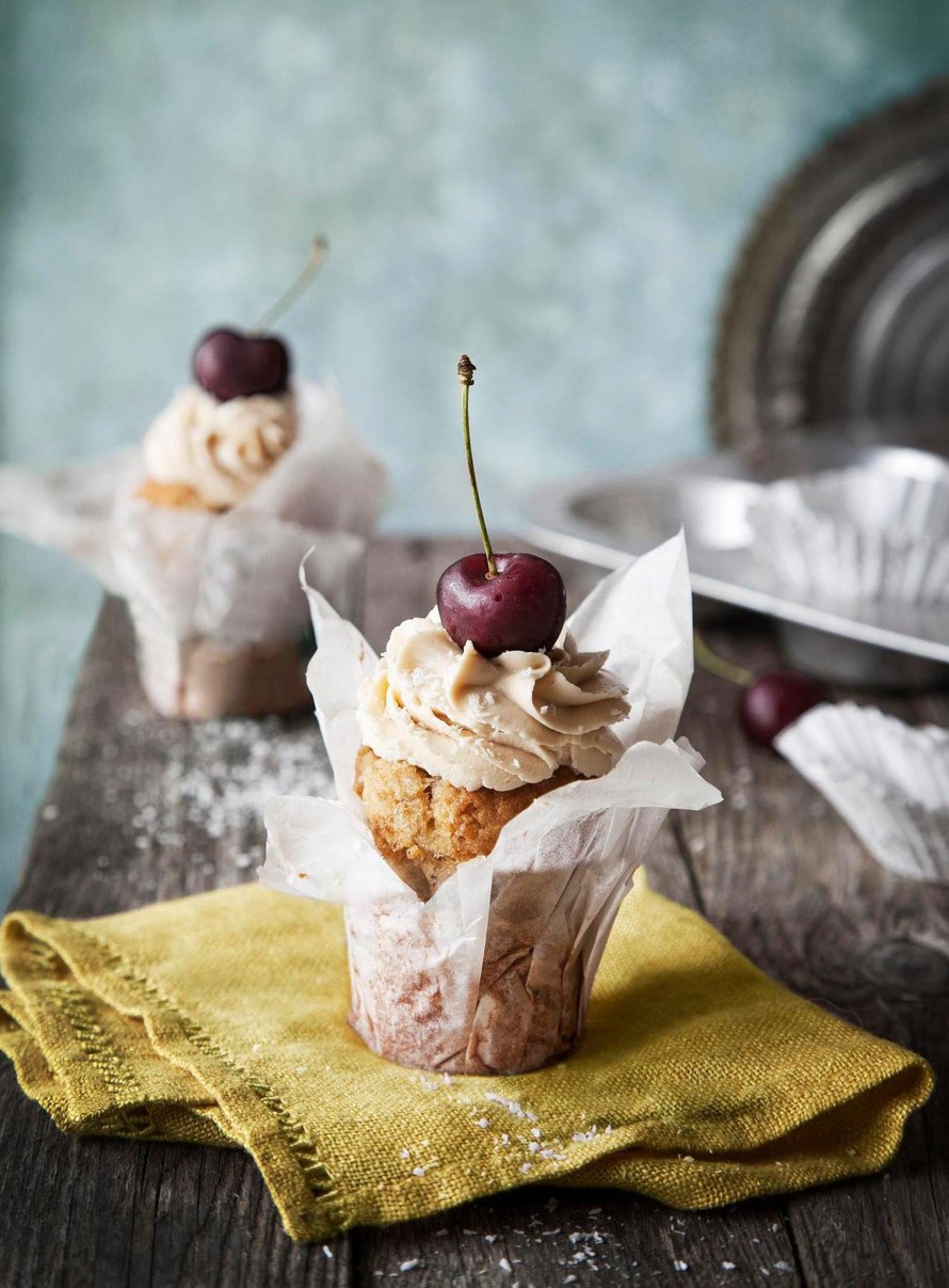 Notkista tuorejuusto. Kuorruta muffinit hieman jäähtyneinä. Ripota päälle kookoshiutaleita ja koristele halutessasi marjoilla.