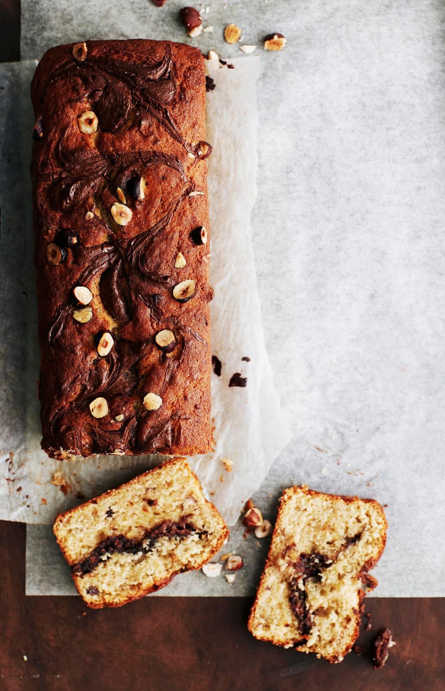 Helppo banaanikakku saa marmorikuvionsa pähkinä-suklaatahnasta. Taikina valmistuu sekoittamalla ainekset yhteen, joten vatkaimen saa unohtaa kaappiin.