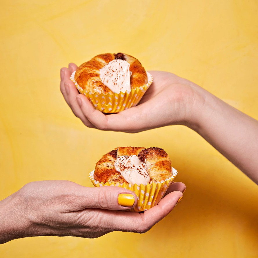 - Lusikoi kahvivaahtoa cruffinien päälle ja ripottele halutessasi hieman kaakaojauhetta. Nauti heti.