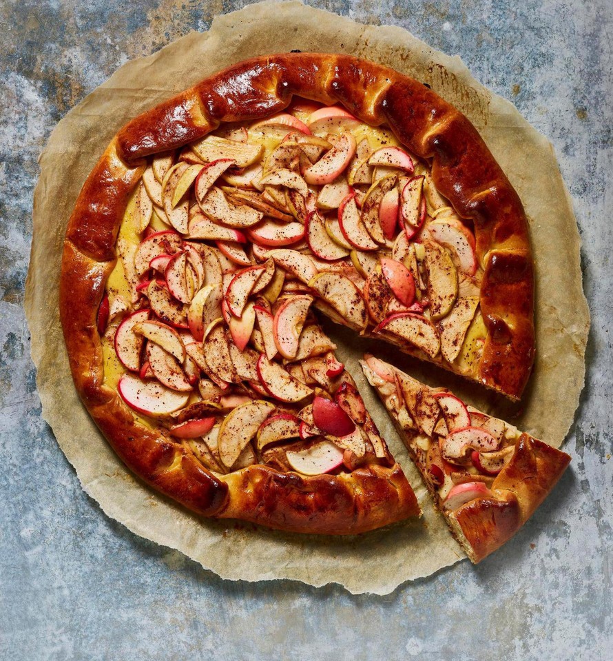 Nostele omenat vaniljakreemin pinnalle, jätä omenoista kertynyt neste kulhoon. Käännä taikinan reunat täytteen päälle. Sivele reunat munalla.