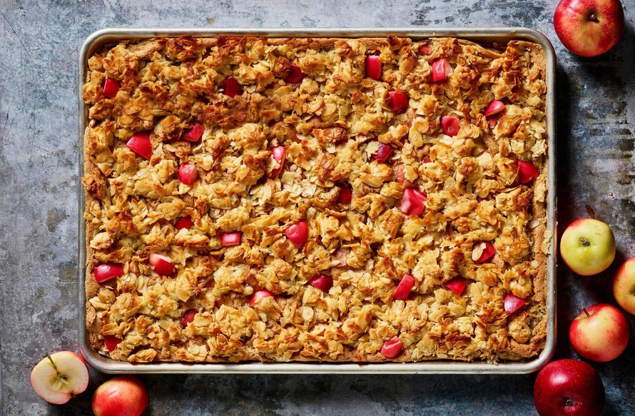 Levitä taikina leivinpaperin päälle reunalliselle uunipellille. Valuta omenoista irronnut liemi talteen. Ripottele omenakuutiot taikinan pinnalle.