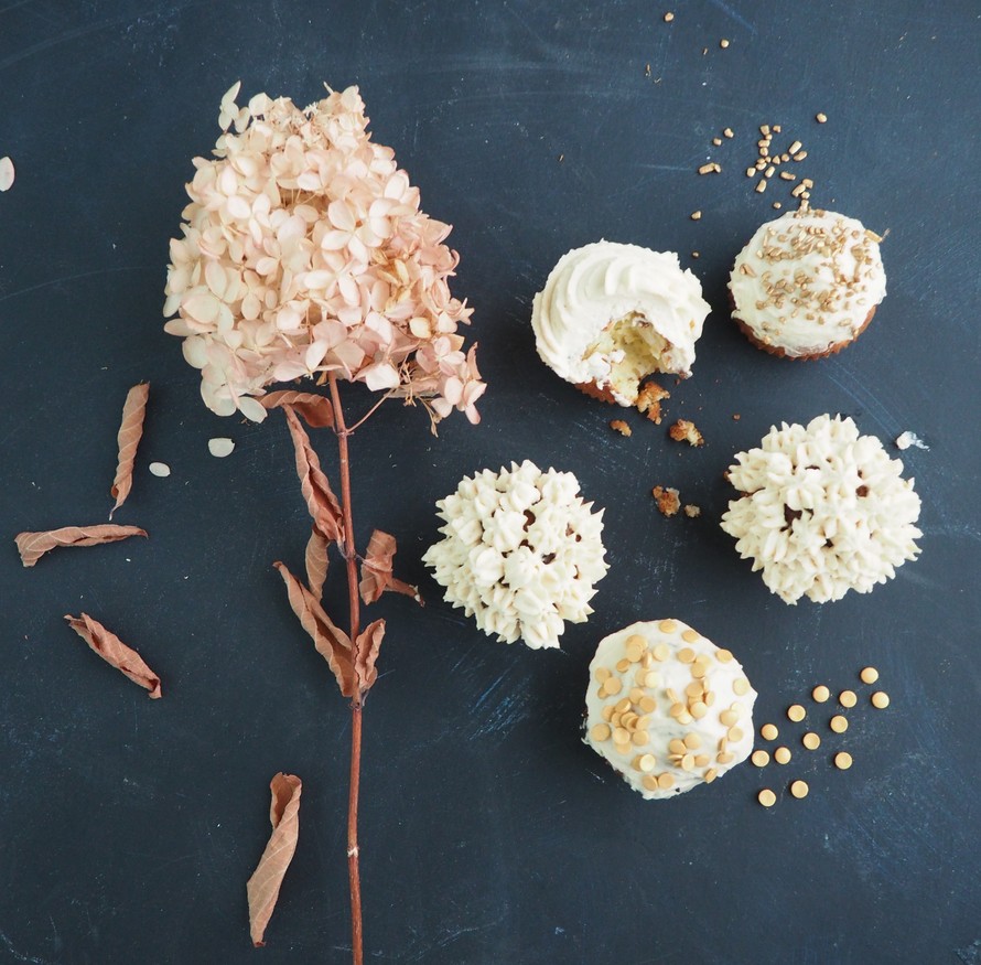 Pursota kuorrute muffinien päälle. Koristele nonparelleilla.