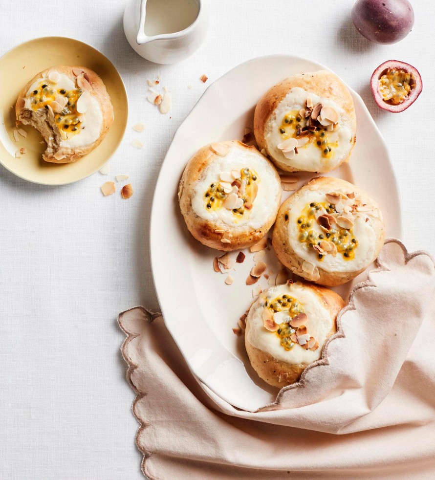 Sekoita jogurttivalmiste, hyvin pestyn puolikkaan sitruunan raastettu kuori ja -mehu sekä sokeri ja vaniljasokeri keskenään. Halkaise passionhedelmät. Paina lasin pohjalla syvennys pullien keskelle. Lusikoi täytettä pullille. Kaavi täytteen päälle passionin hedelmälihaa. Voitele pullien reunat mantelimaidolla. Ripottele päälle mantelilastuja.