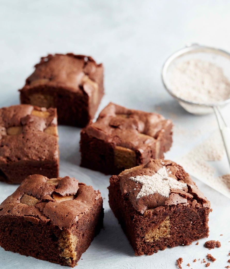 Vinkki! Koristele browniet tähtipölyllä. Piirrä piparimuotilla kuvio leivinpaperille. Leikkaa paperiin kuvion mukainen aukko. Aseta paperi browniepalan päälle. Mausta tomusokeri ripauksella kanelia ja tomuta kanelisokeria leivonnaisen pintaan.