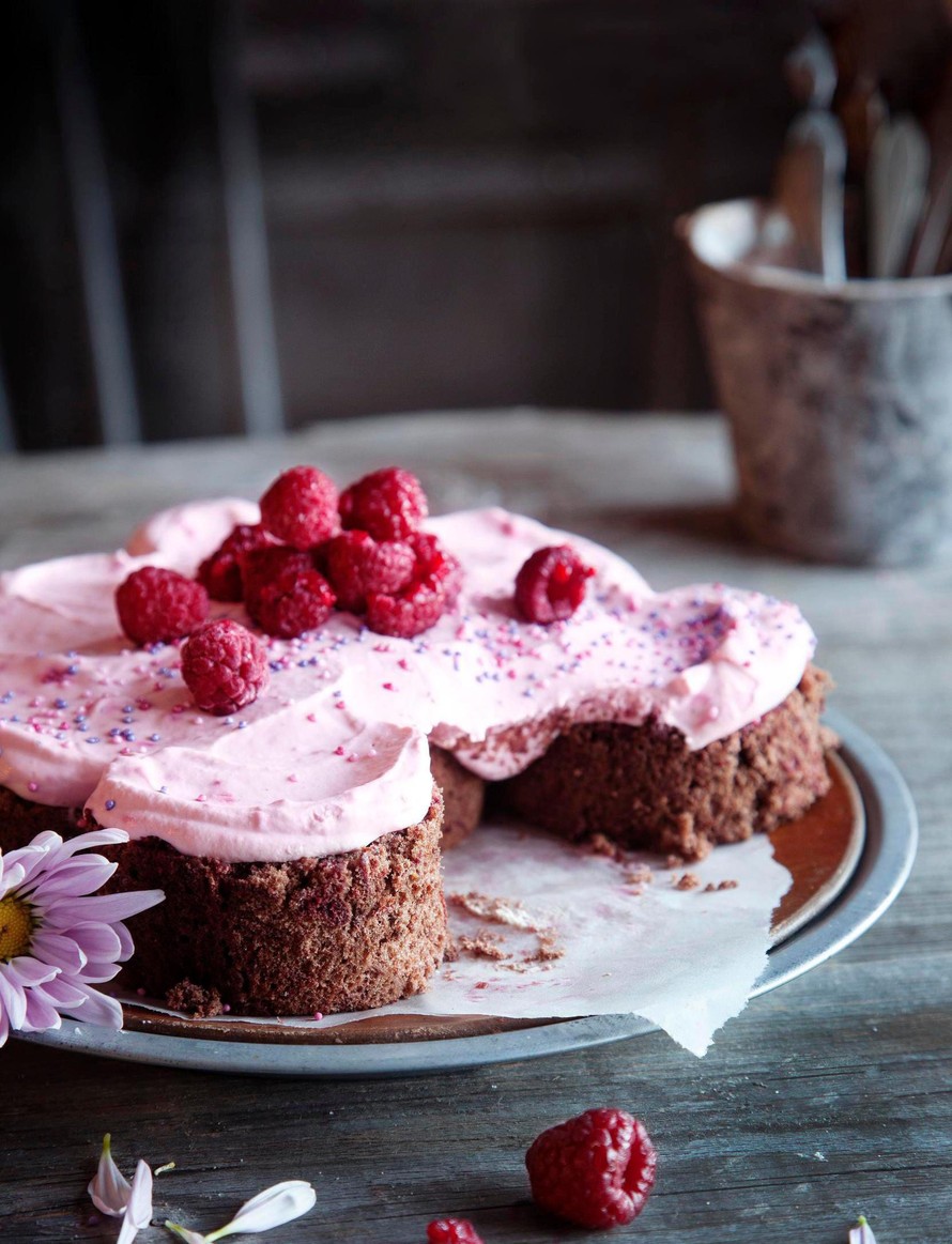 Leikkaa tortusta paksuja viipaleita. Asettele ne kukan muotoon tarjoiluastialle ja levitä loppu täyte viipaleiden päälle. Koristele esimerkiksi vadelmilla.