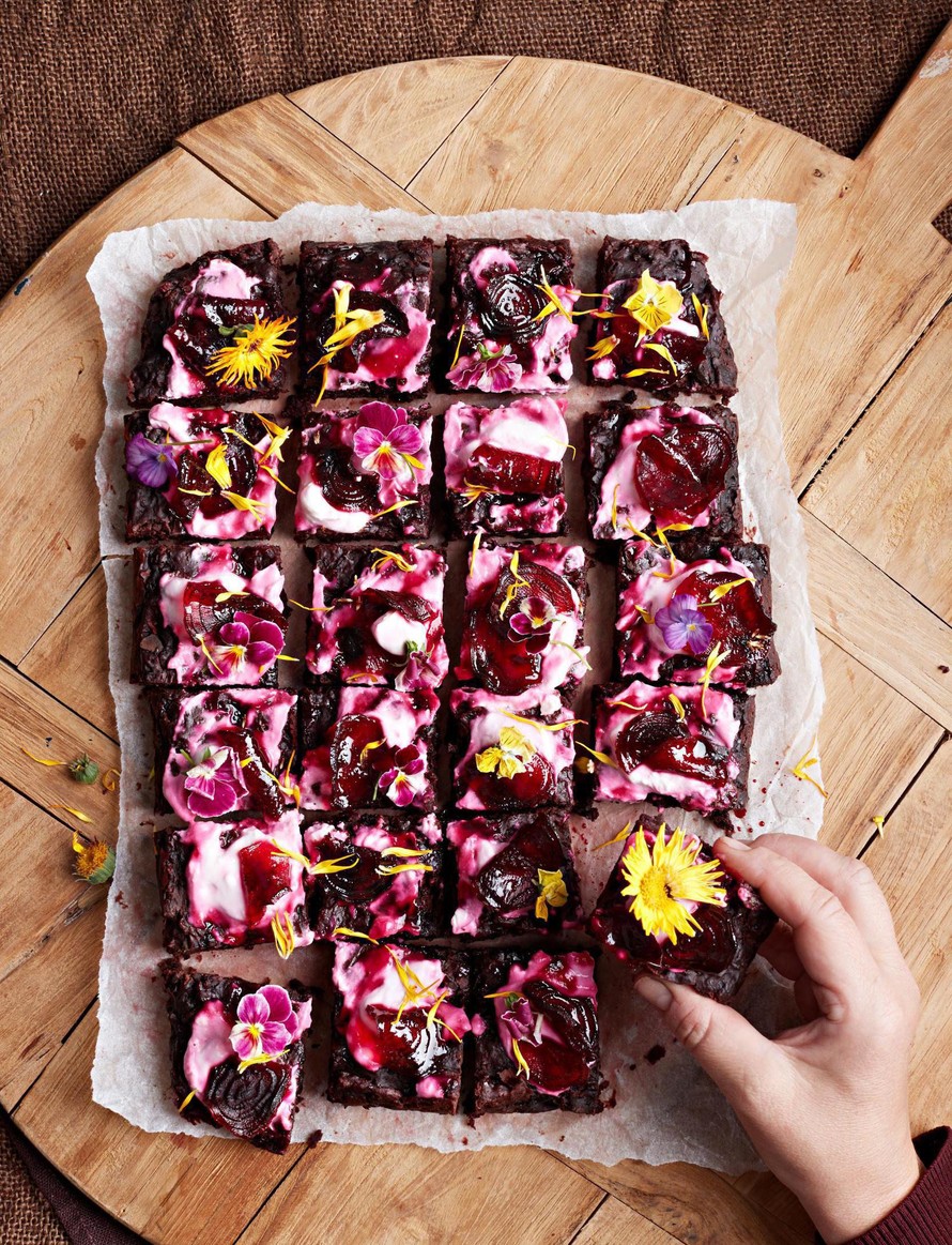 - Säästä sokerilientä puoli desilitraa ja sekoita siihen kaurafraiche. Levitä seos brownien pinnalle. Koristele punajuurisiivuilla ja kukkasilla.