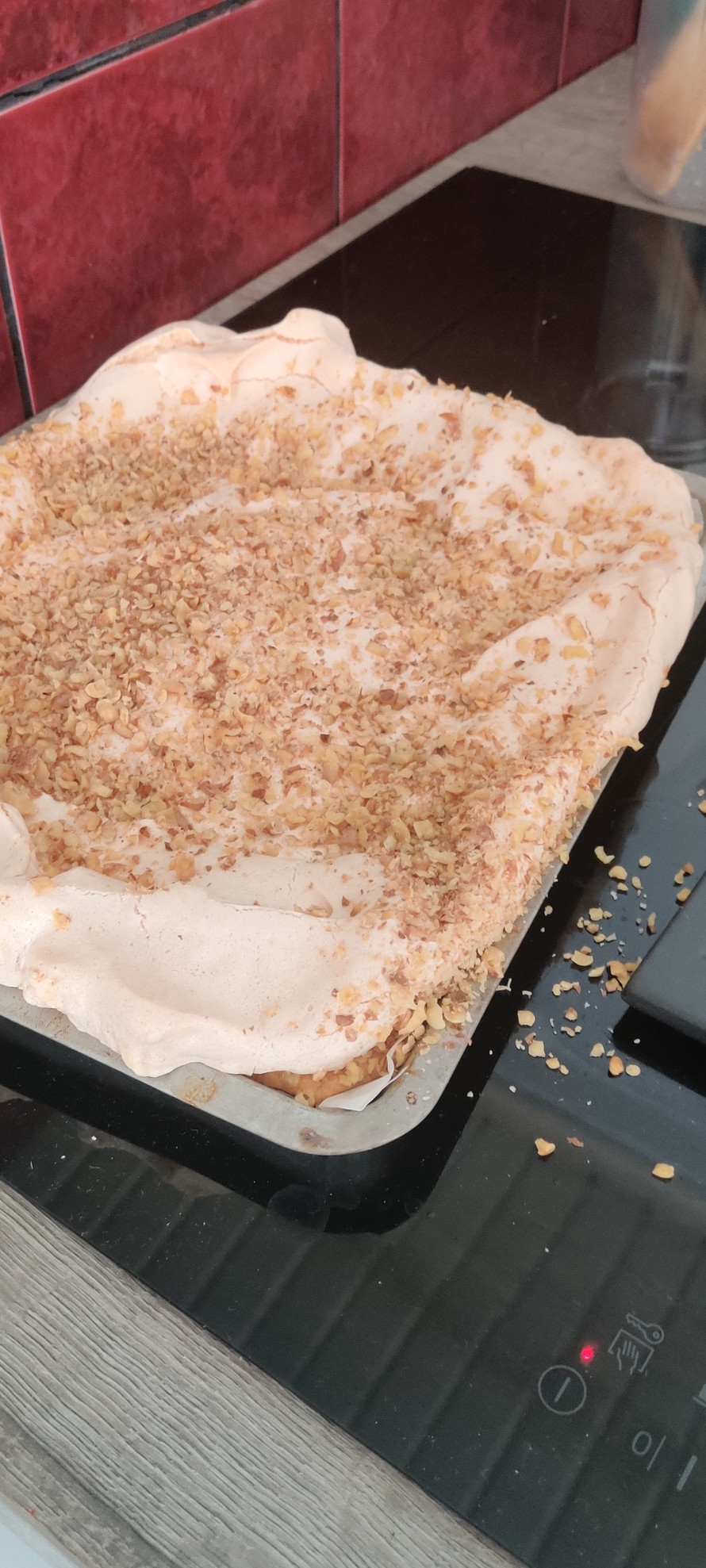 vatkaa huoneenlämpöiset valkuaiset kovaksi vaahdoksi. Lisää sokeri ja vatkaa vielä hetki. Levitä marenki taikinapohjien päälle ja ripottele pinnalle rouhittua pähkinää. Paista pohjia 150 ast/ n 40 min. Jäähdytä.