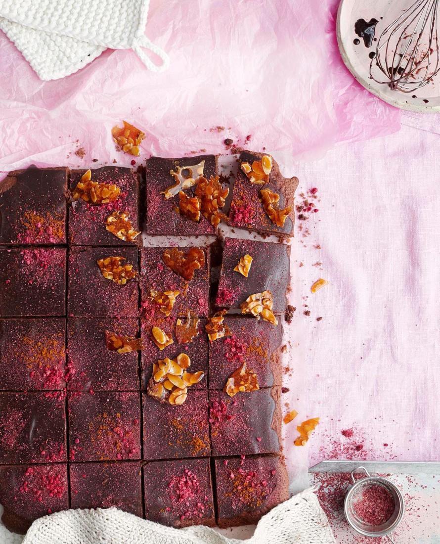 - Kaada kuorrute haalealle pohjalle. Tasoita nuolijalla. Ripottele päälle marjajauhetta ja kuivattuja vadelmia. Leikkaa levy ruuduiksi. Koristele krokantilla.